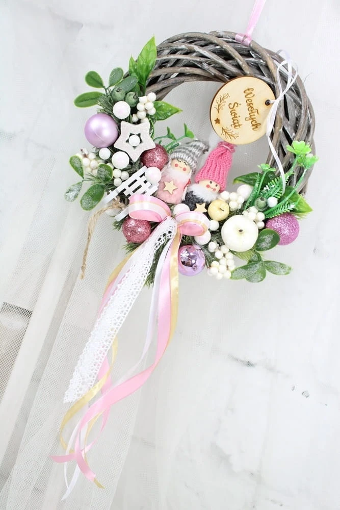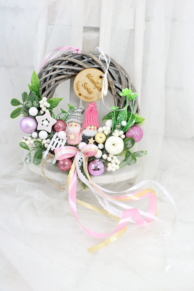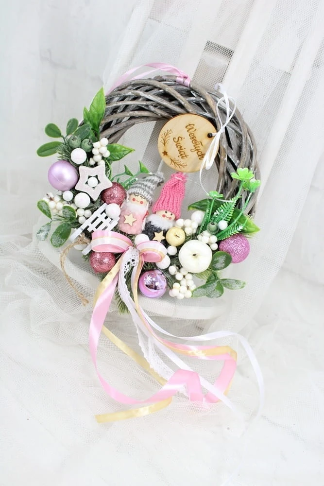 Utrzymany w tonacji różu z dodatkiem zieleni dekoracyjnych gałązek. Niezwykły dodatek stanową piękne zimowe laleczki, kaskadowo spływająca kokarda oraz drewniany napis Spokojnych Świąt.