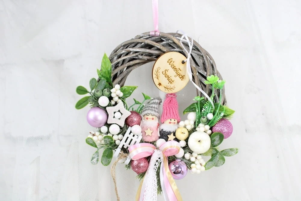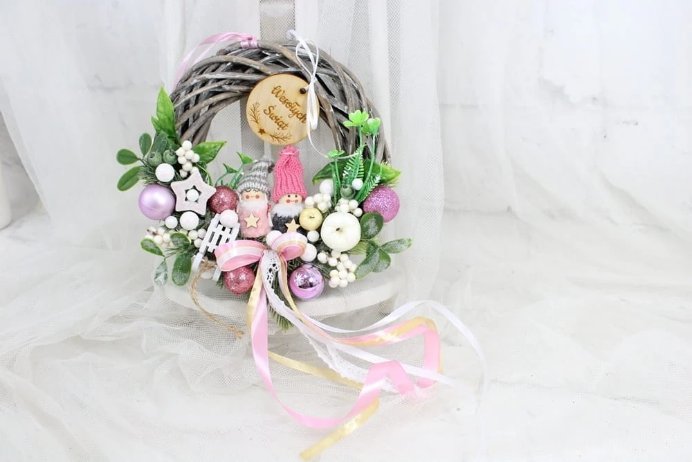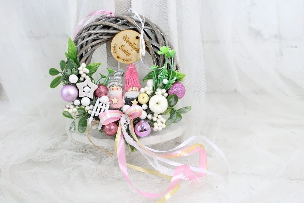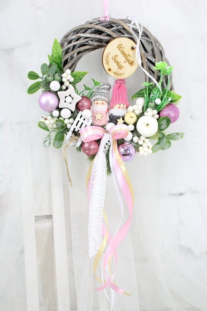Niepowtarzalny, uroczy i wyjątkowy wianuszek świąteczny wykonany z wysokiej jakości ozdób na podstawie z naturalnego ratanowego wianka.