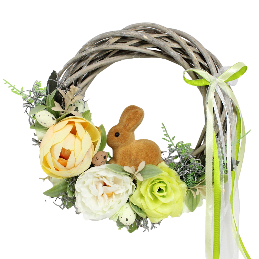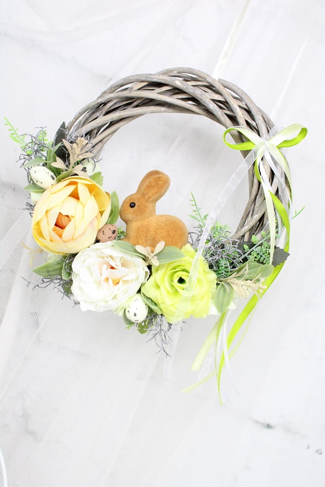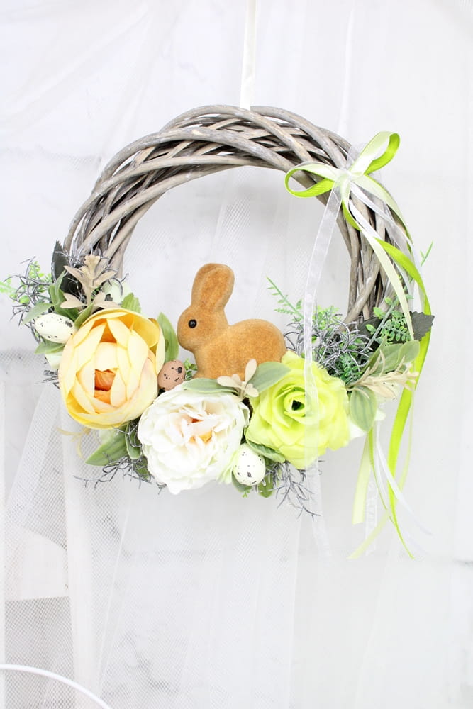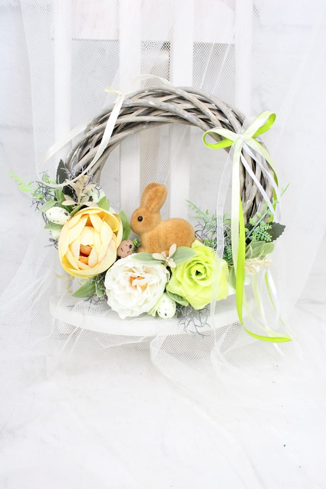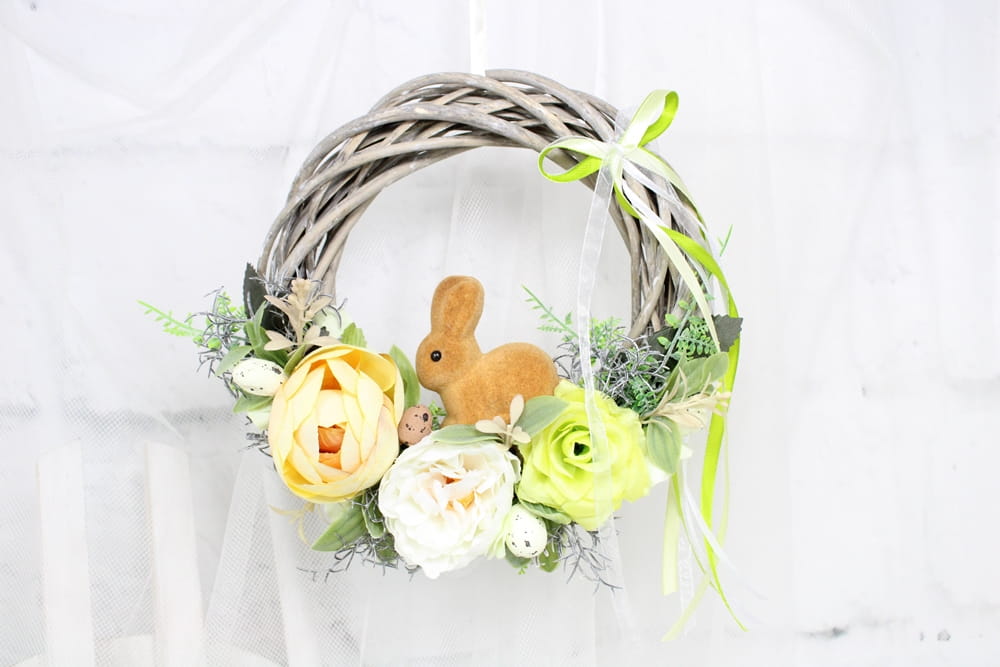 Niezwykłego uroku dodaje wiankowi ceramiczny zielony zajączek.