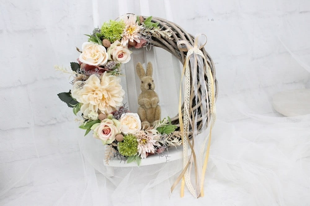 Piękny wianek wielkanocny o średnicy 30cm udekorowany kwiatami róż, pełnika i astrów. W odcieniach jasnego pudrowego różu i beżu.