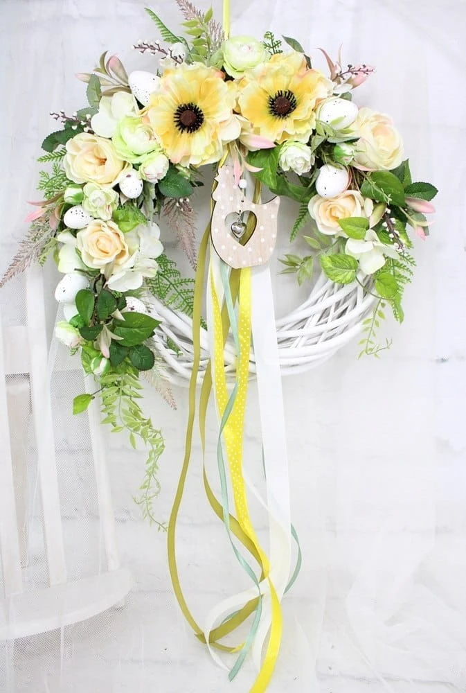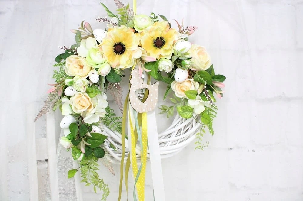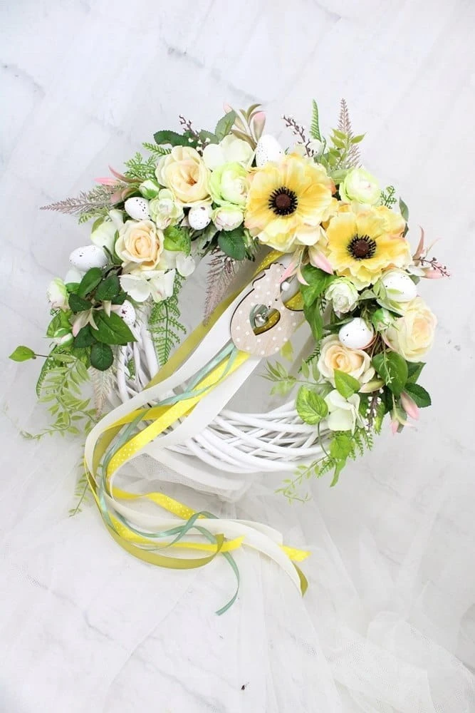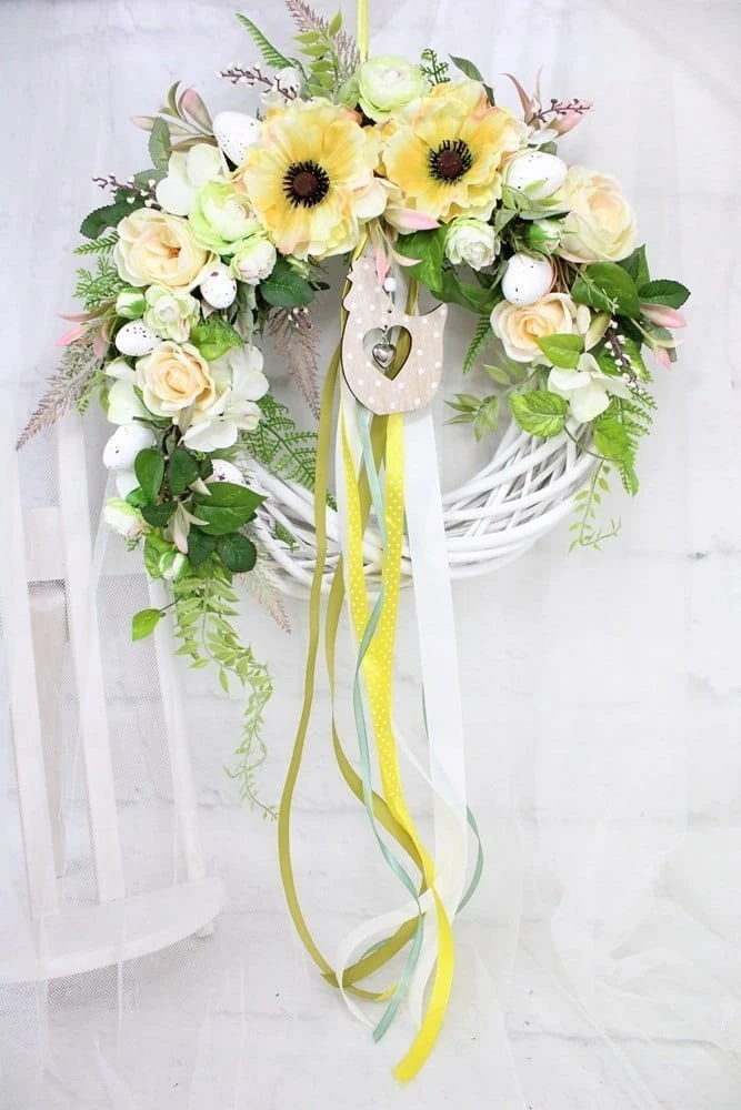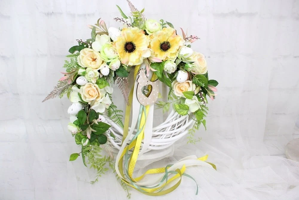 Wiosenny, wielkanocny wianek z wikliny o średnicy wianka bazy 35cm z dekoracją 40-45cm. Udekorowany wiosennymi kwiatami w odcieniach ciepłej zieleni, pastelowej cytryny i kremu.