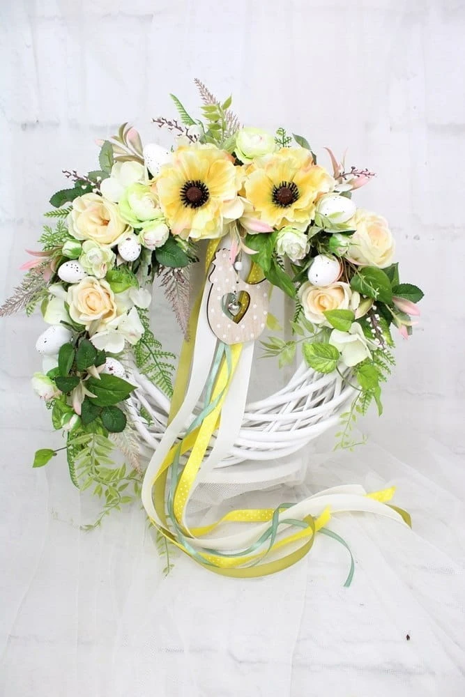 Dodatkowo ozdobiony śliczną zawieszką kurki, jajkami, liśćmi, dekoracyjną trawą oraz tasiemką dopasowaną kolorystycznie.