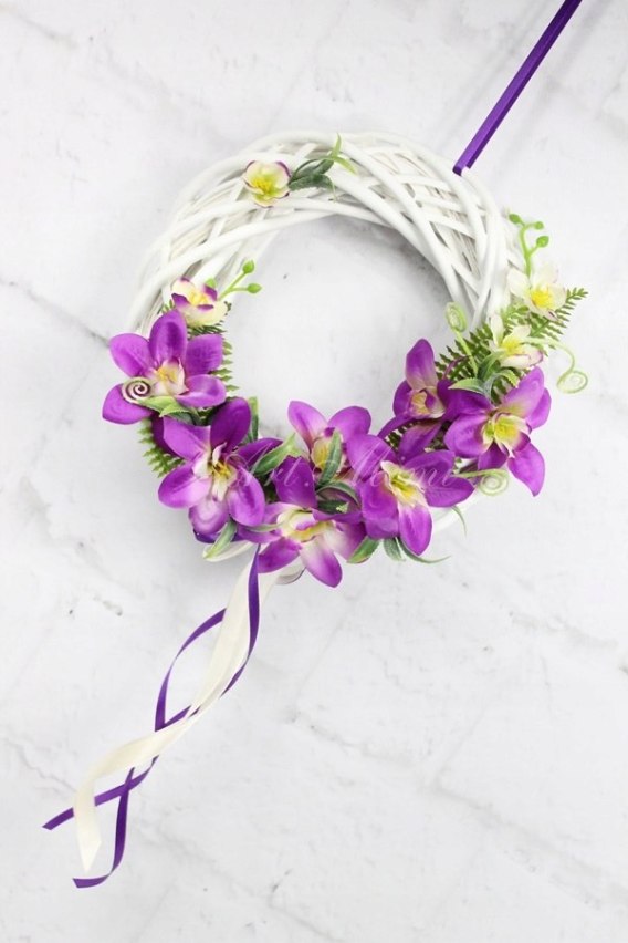 Wianek wiklinowy wybielany o średnicy 25cm, udekorowany kwiatami i pąkami satynowego storczyka w odcieniach purpury.