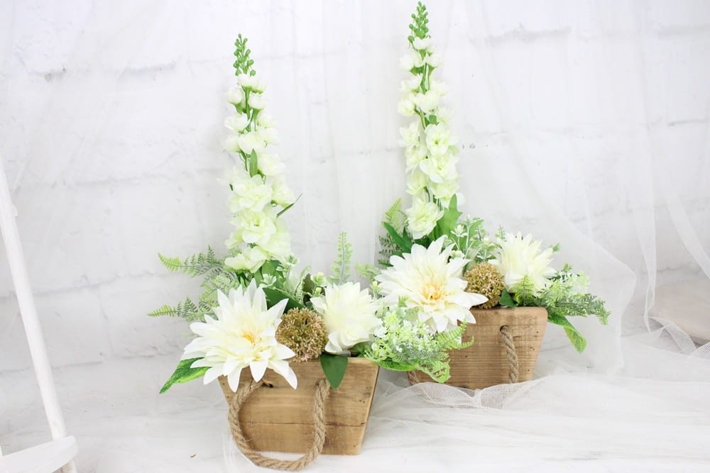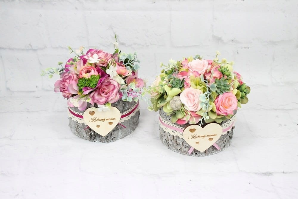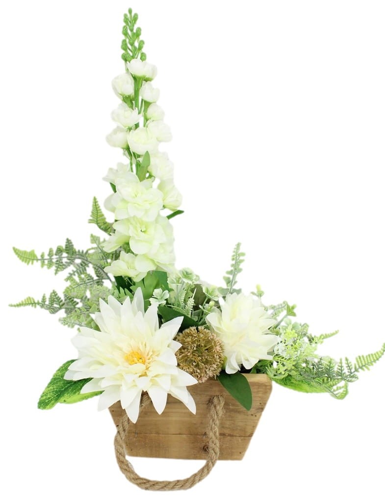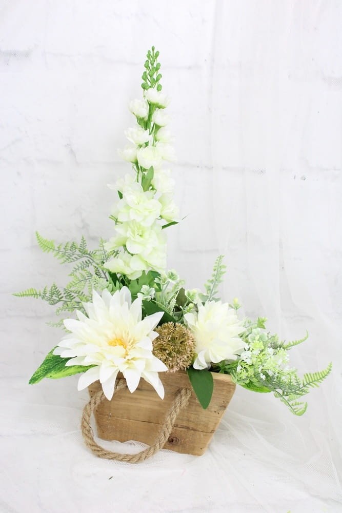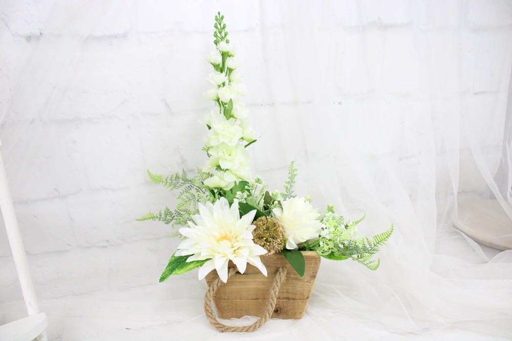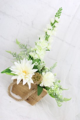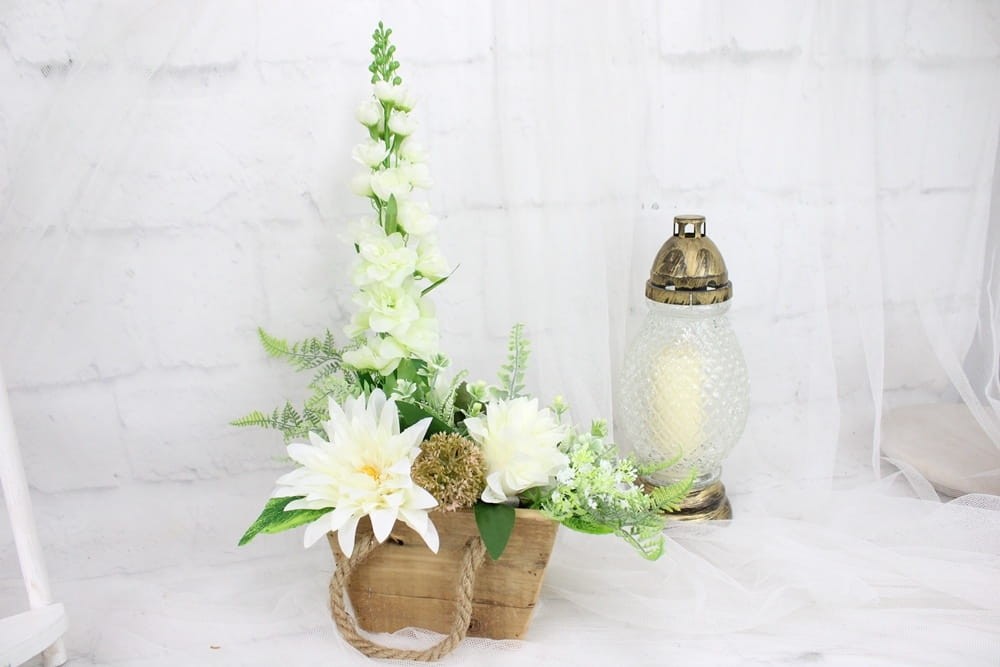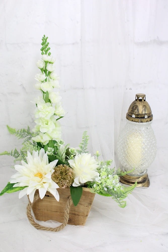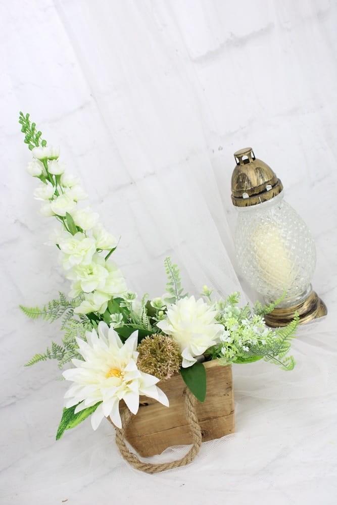 Niezwykle stylowa i oryginalna kompozycja nagrobna, wykonana z wysokiej jakości sztucznych kwiatów oraz podstawy z drewnianej doniczki ozdobionej sznurkiem.